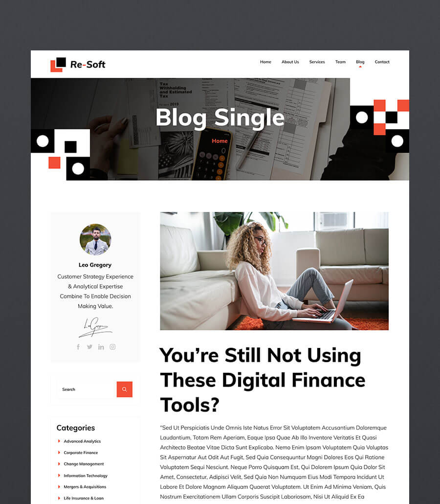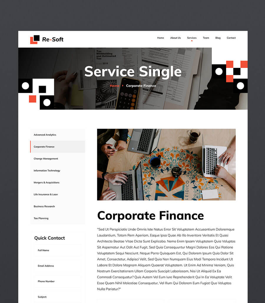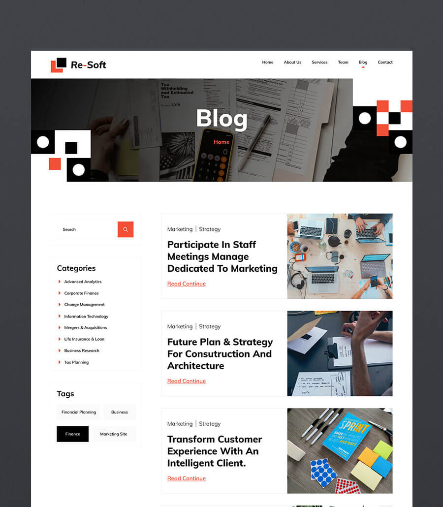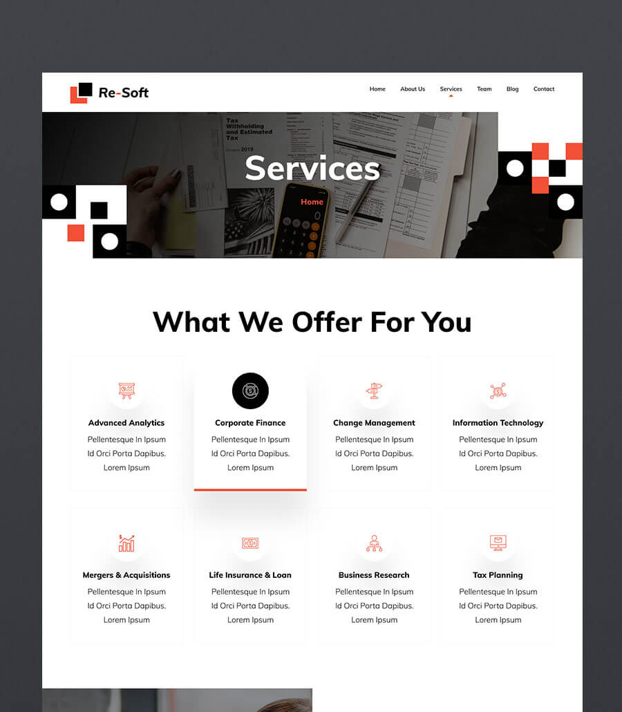 A refined and trustworthy website developed for a finance-focused agency, emphasizing clarity, professionalism, and strategic insight. The layout presents services, financial tools, and expertise through structured sections and a confident visual hierarchy. The result is a credible, polished digital presence that reinforces Re-Soft’s authority in the financial services landscape.